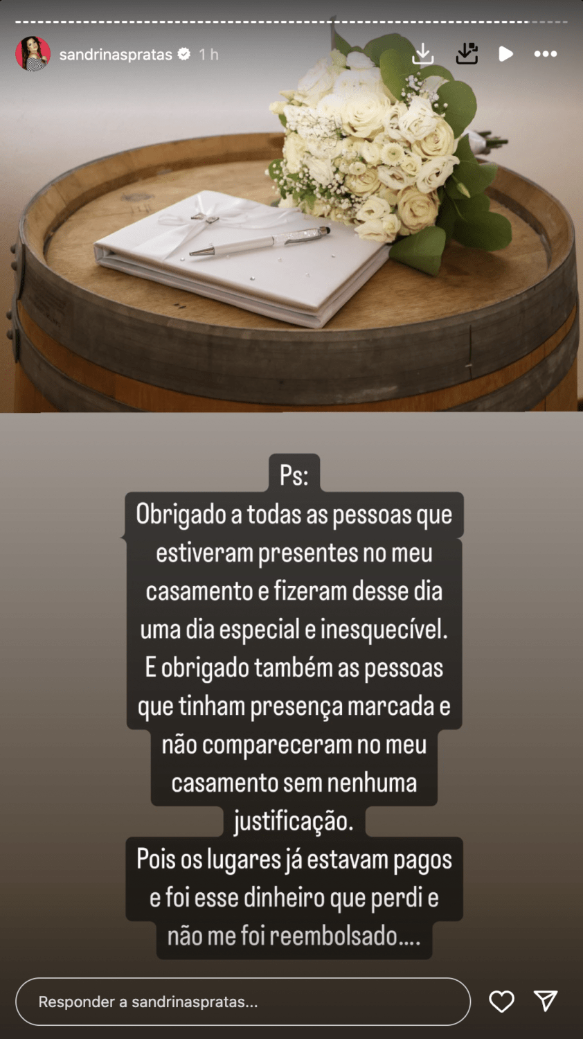 E não se ficou por aí, Sandrina também deixou uma ‘farpa’ às pessoas que confirmaram presença e não apareceram: “E obrigado também às pessoas que tinham presença marcada e não compareceram no meu casamento sem nenhuma justificação pois os lugares já estavam pagos e foi esse dinheiro que perdi e não me foi reembolsado”.