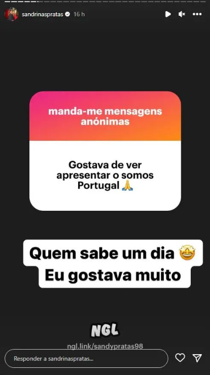 Questionada sobre a possibilidade de apresentar o “Somos Portugal”, Sandrina Pratas confessou: “Quem sabe um dia. Eu gostava muito”.