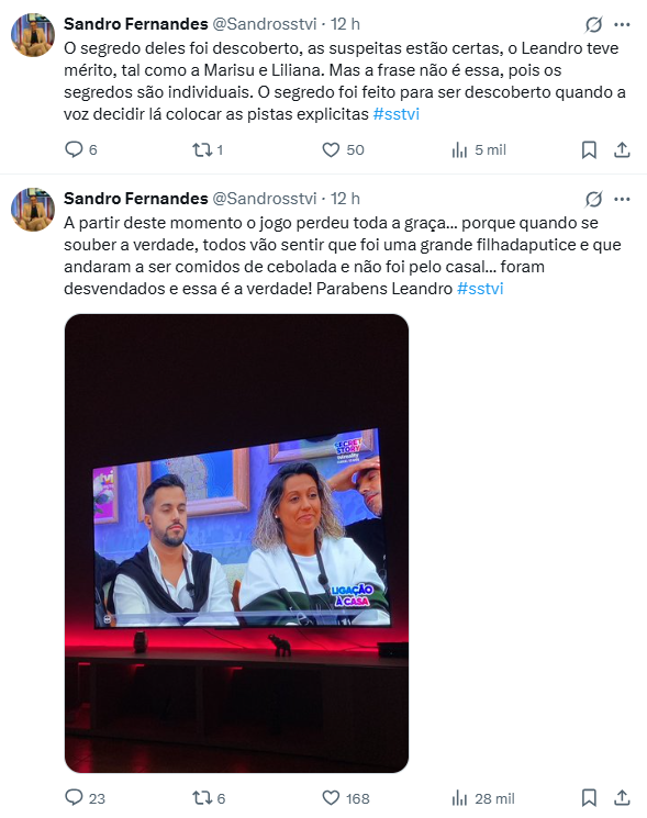 “As suspeitas estavam certas e o Leandro teve mérito, tal como a Marisu e a Liliana. Mas a frase exata não é essa. Cada segredo é individual e só será oficialmente revelado quando a voz decidir dar pistas claras.”