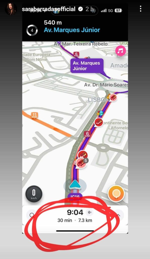 Através das suas redes sociais, a atriz divulgou uma imagem do GPS onde é possível ver que a atriz iria (segundo a aplicação) demorar 30 minutos para percorrer pouco mais de 7km de estrada.