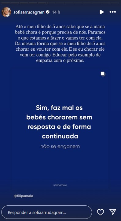 O vídeo gerou reações nas redes sociais, e na segunda-feira, 10 de março, Sofia Arruda partilhou uma publicação da psicóloga Filipa Malo Franco, que alertou para o mal de ignorar o choro dos bebés de forma continuada, afirmando que “sim, faz mal os bebés chorarem sem resposta de forma continuada”. Sofia também partilhou a sua visão, destacando a importância de educar pelo exemplo de empatia, seja para com um bebé ou uma criança mais velha.