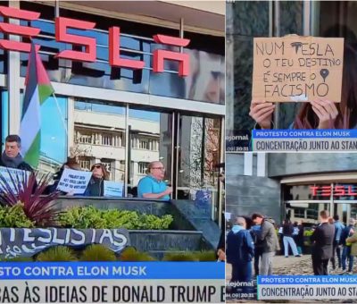 Em Lisboa, cerca de dez manifestantes reuniram-se em frente ao stand da Tesla para protestar contra o envolvimento de Elon Musk na Administração dos E