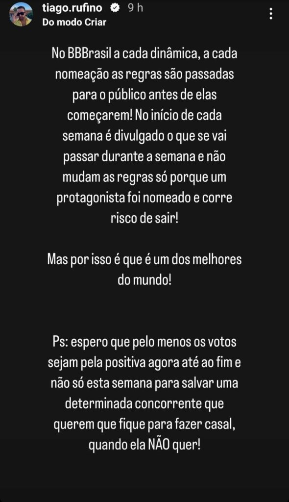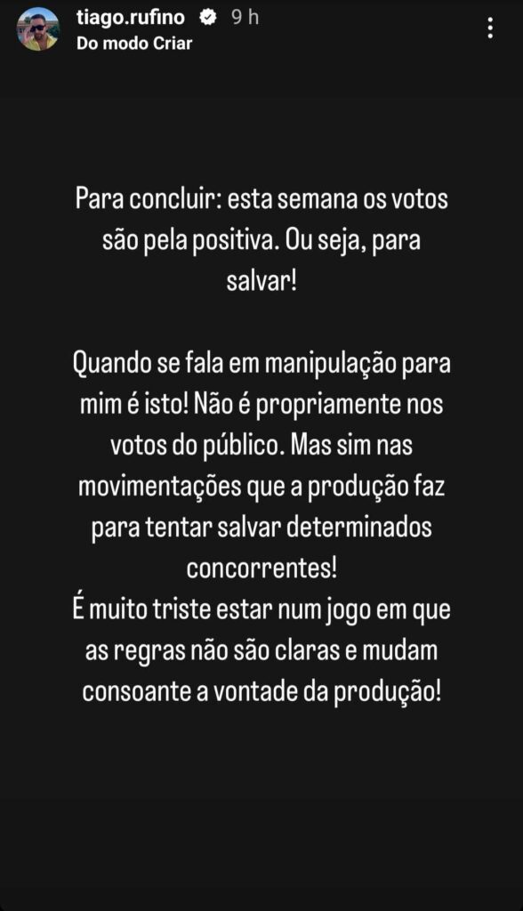 Através de stories, Tiago começou por escrever: “Quando se fala em manipulação para mim é isto! Não é propriamente nos votos do público. Mas sim nas movimentações que a produção faz para tentar salvar determinados concorrentes! É muito triste estar num jogo em que as regras não são claras e mudam consoante a vontade da produção!