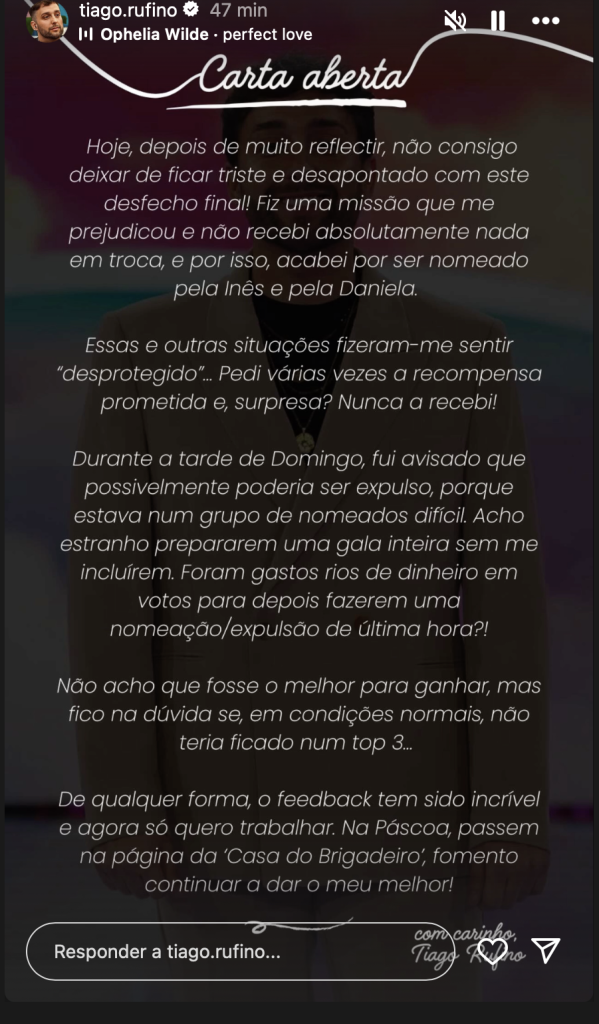 Tiago Rufino usou as redes sociais para manifestar a sua insatisfação com a forma como foi eliminado do Desafio Final. Numa carta aberta publicada na noite de 11 de março, o ex-concorrente levantou questões sobre a transparência do jogo e criticou a produção do reality show.