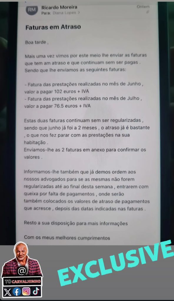 O comentarista não se ficou por aqui e partilhou até imagens das faturas não pagas, alegadamente fornecidas pela empresa em questão, para expor a situação de Diana Lopes.