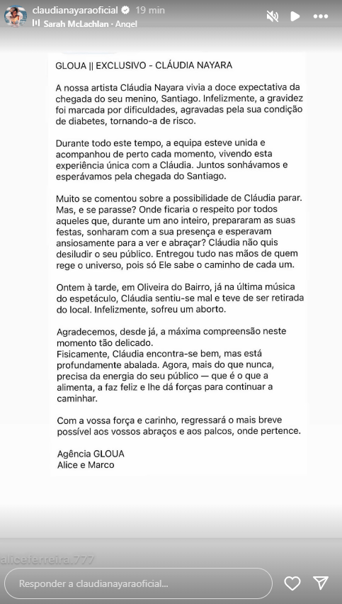 A notícia foi confirmada esta segunda-feira, 15 de setembro, pela agência que representa a cantora, através de um comunicado nas redes sociais. Cláudia, que aguardava com ansiedade a chegada do filho Santiago, vivia uma gravidez de risco devido à diabetes e acabou por sofrer um aborto na reta final de um concerto.