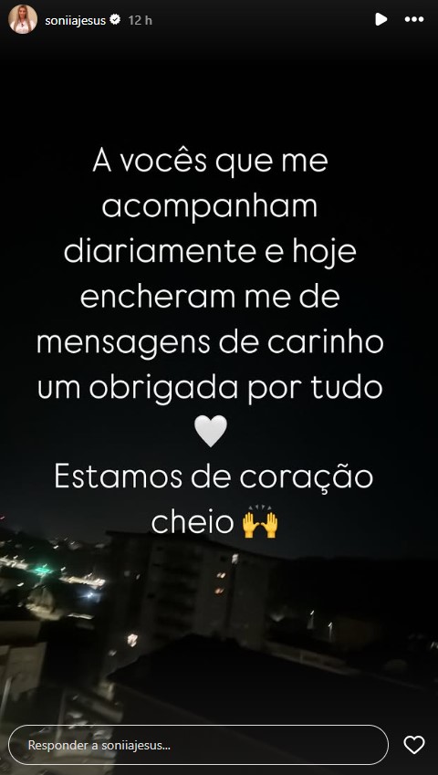 Sónia terminou o dia com um agradecimento aos seguidores, que a apoiaram ao longo do processo: “Hoje encheram-me de mensagens de carinho. Um obrigada por tudo. Estamos de coração cheio.”